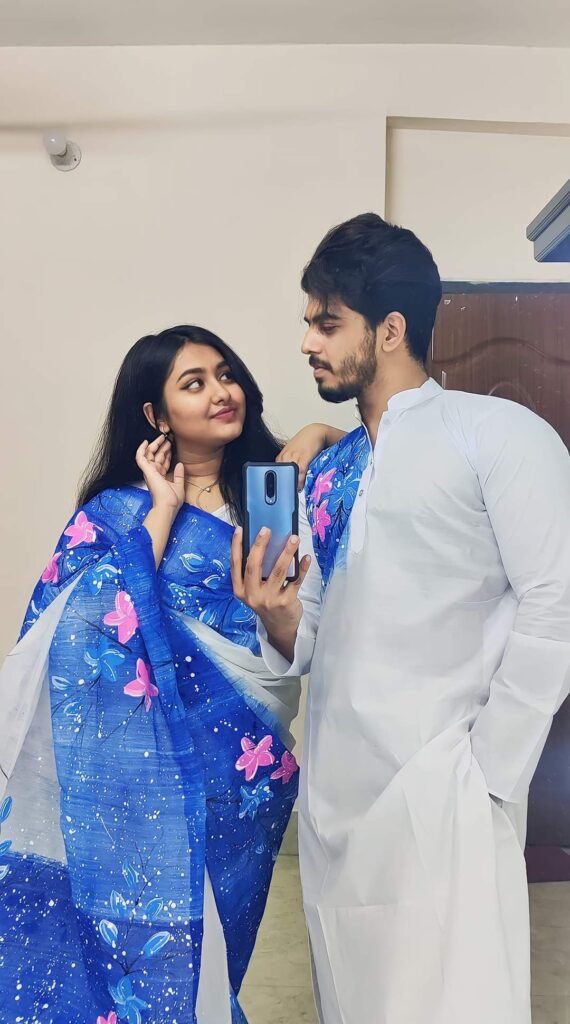 •  হাফসিল্ক শাড়ি এবং ধুপিয়ান কটন পাঞ্জাবি
